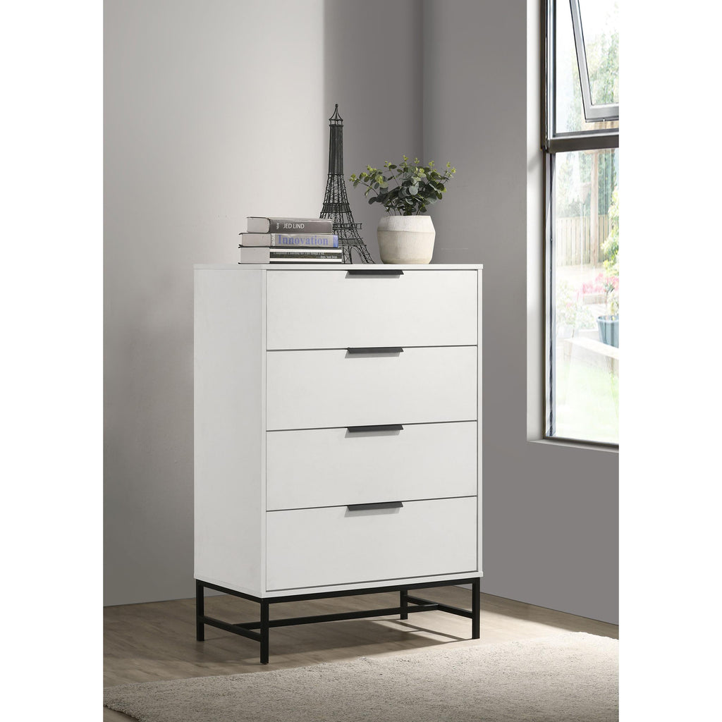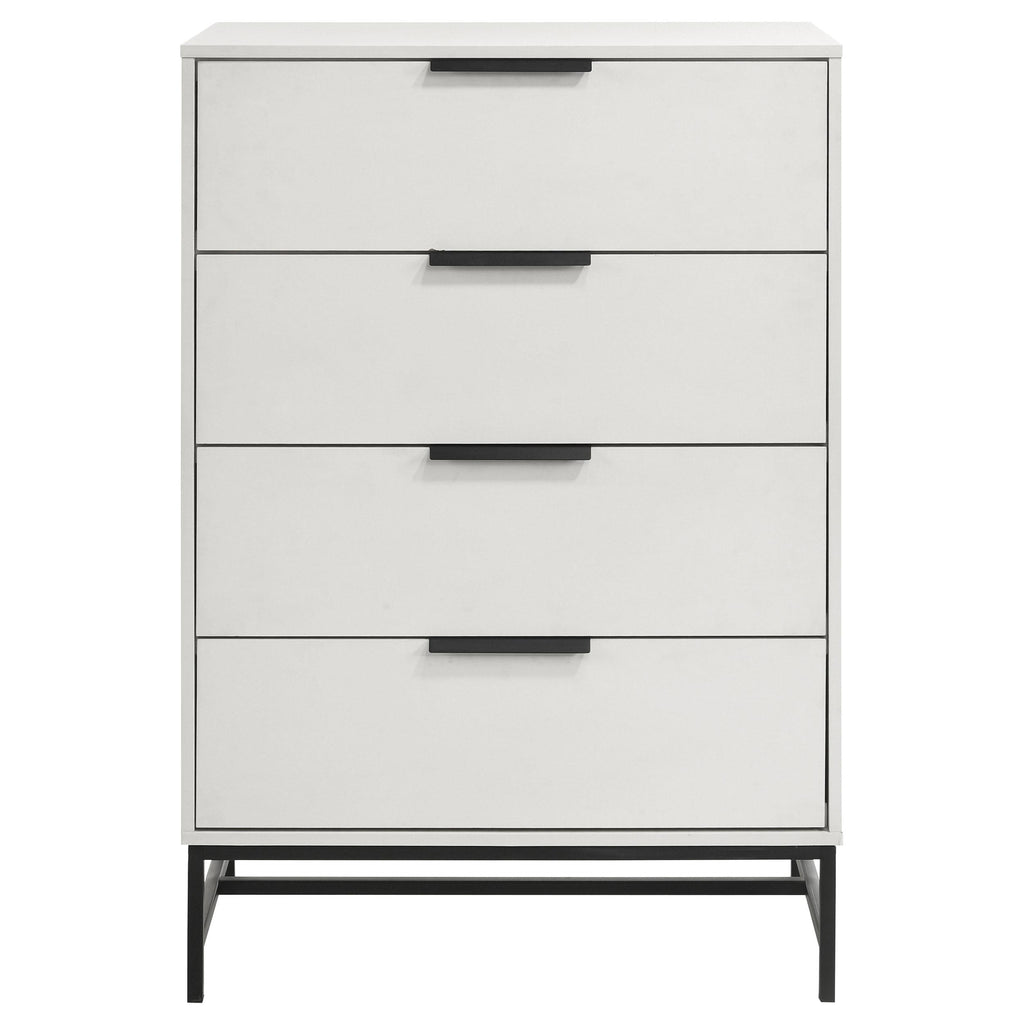 • A modern four-drawer chest features a sleek silhouettes and bold contrasting elements